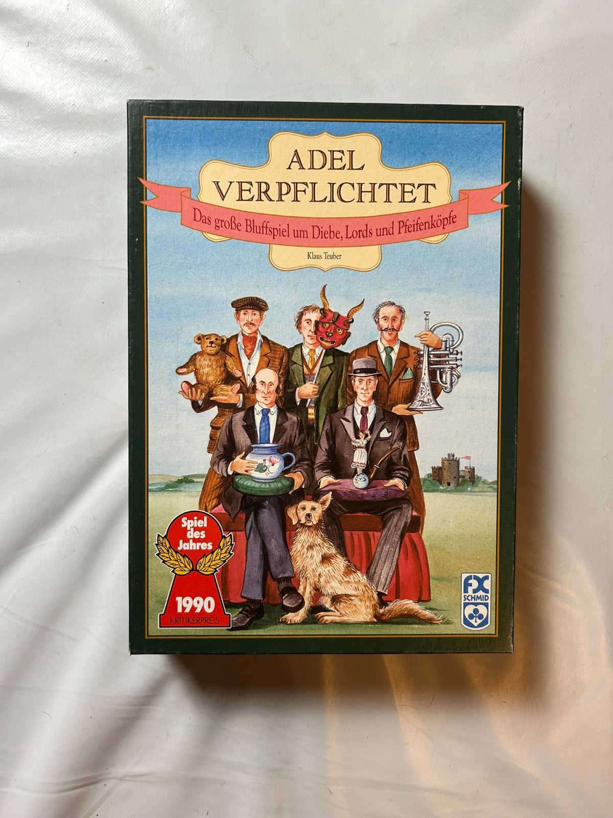Adel verpflichtet von FX Schmid (1990) ist ein preisgekröntes Gesellschafts- und Brettspiel, das Bluff, Taktik und feinen Humor vereint. Die Spieler schlüpfen in die Rollen exzentrischer Adliger, die um die wertvollste Kunstsammlung wetteifern – durch geschicktes Planen, Stehlen und Sammeln. Dieses vollständige Spiel bietet strategische Tiefe, raffinierte Mechaniken und charmanten Wettstreit für Spielrunden mit Stil.