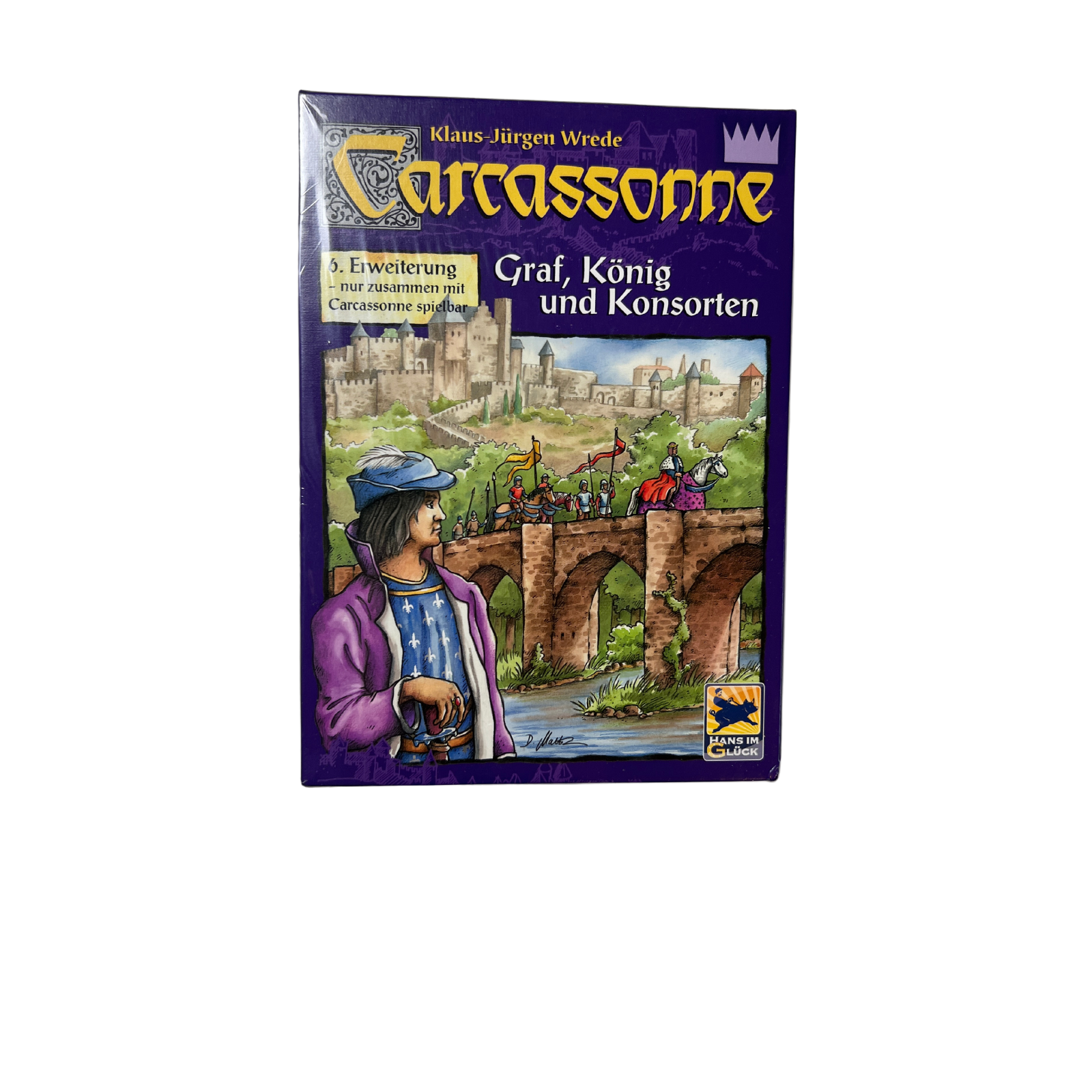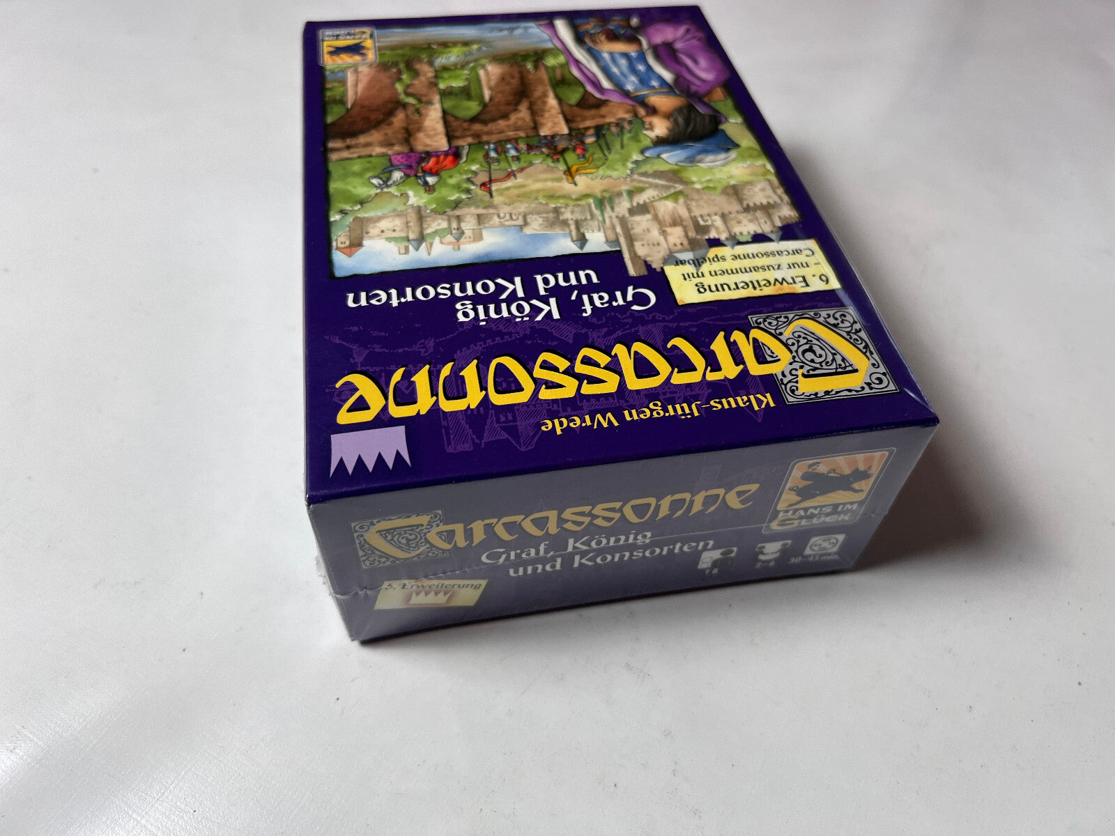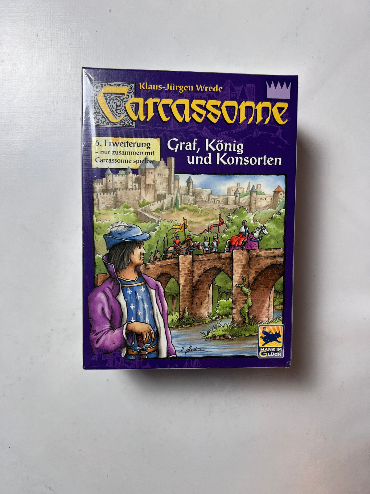 Die 6. Erweiterung „Graf, König und Konsorten“ für Carcassonne erschien 2007 im Hans im Glück Verlag und vereint vier beliebte Mini-Erweiterungen in einer Box