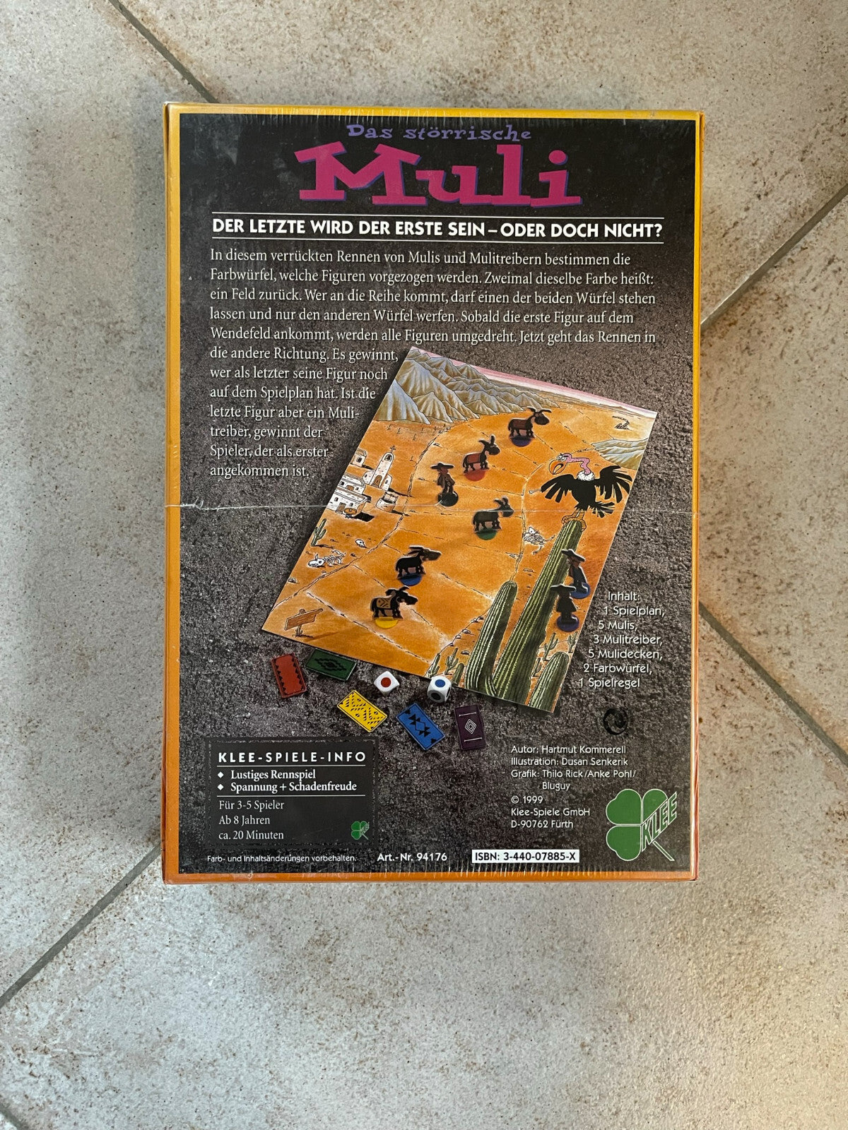 Das Brettspiel „Das störrische Muli“ von Hartmut Kommerell ist ein humorvolles Familienspiel, das 1999 bei Klee Spiele erschien. Mit einer Spielzeit von etwa 20 Minuten eignet es sich ideal für 3 bis 5 Spieler ab 8 Jahren. Das Spielprinzip ist einfach: Jeder Spieler übernimmt die Rolle eines Mulitreibers, der versucht, sein störrisches Muli als Erster ins Ziel zu bringen. Dabei bestimmen Würfelwürfe, welche Muli sich bewegen, wobei ein Pasch dazu führt, dass das Muli zurückgesetzt wird. Das Ziel ist es, das eigene Muli strategisch zu steuern und dabei die anderen Spieler auszutricksen.