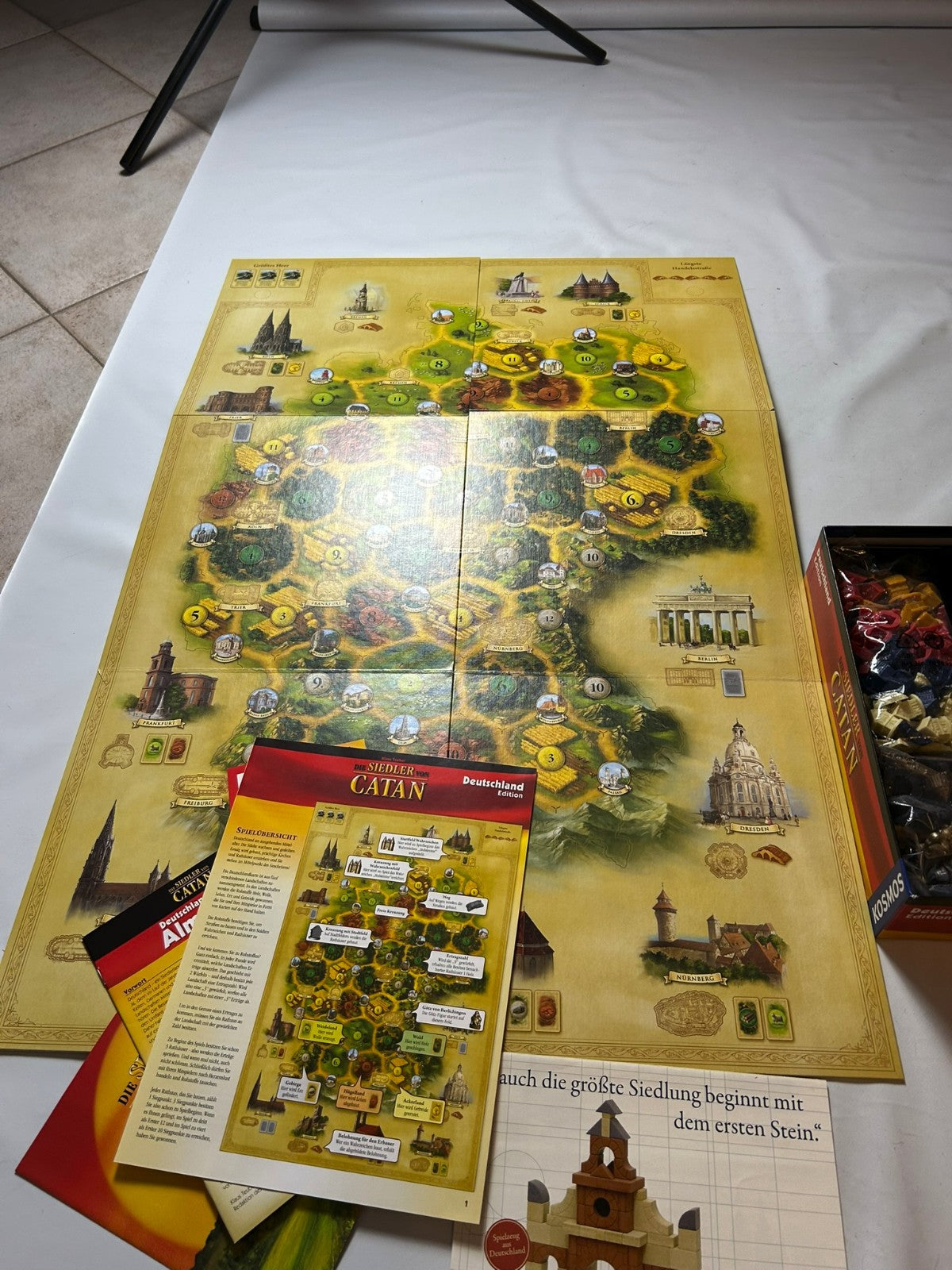 Die Siedler von Catan Deutschland Edition von Kosmos aus dem Jahr 2008 verbindet den beliebten Catan-Spielmechanismus mit einer spannenden Reise durch die deutsche Geschichte. Spieler errichten Straßen, Städte und Wahrzeichen in verschiedenen Regionen Deutschlands und sammeln dabei wertvolle Rohstoffe. Diese unbespielte Ausgabe bietet strategischen Spielspaß mit historischem Bezug und ist ein besonderes Highlight für Sammler und Fans des Catan-Klassikers.