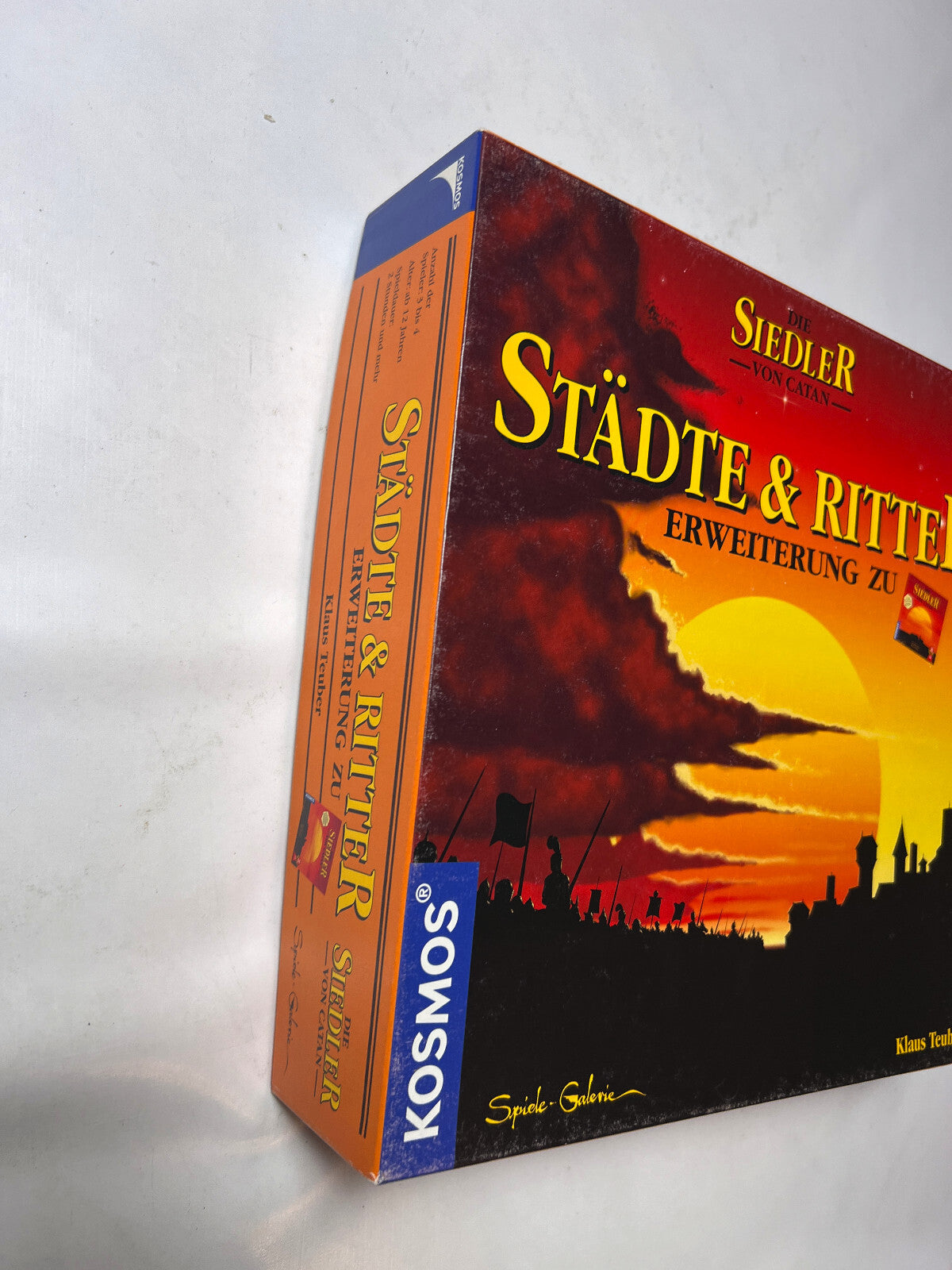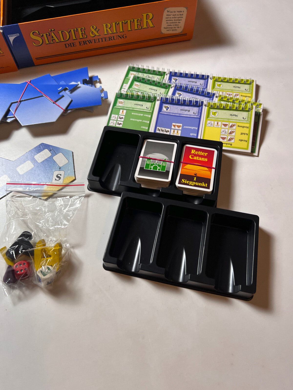 Die Städte und Ritter Erweiterung verändert das Spielgeschehen durch neue Mechanismen wie die Einführung von Ritterkarten, Fortschrittsentwicklungen und einem zusätzlichen Spielplan-Element, das das Spielerlebnis auf eine neue Stufe hebt. Diese Erweiterung ist vollständig und perfekt für alle, die ihre Catan-Erfahrung erweitern möchten.