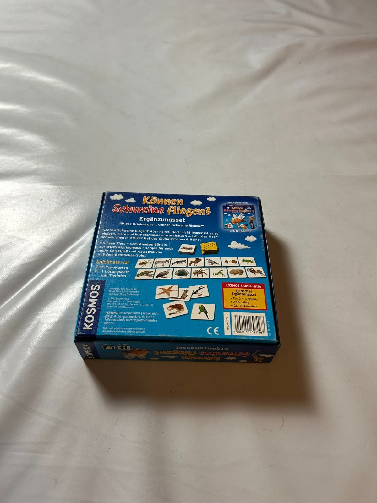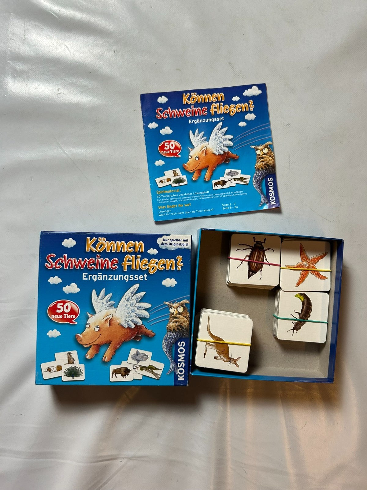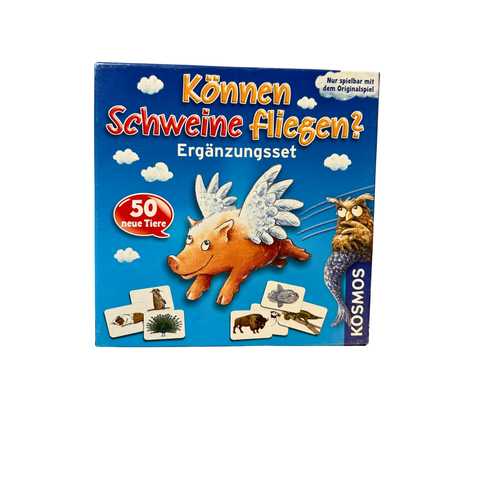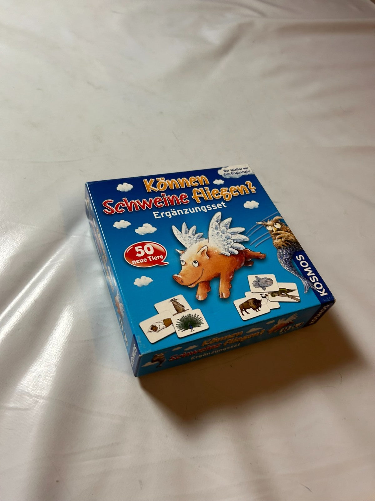 Können Schweine fliegen? – Ergänzungsset von Kosmos (2012) erweitert das beliebte Tier-Wissensspiel um viele neue, spannende Fragen und Tierkarten. Die Spieler testen ihr Wissen über die Tierwelt und entdecken verblüffende Fakten rund um Fähigkeiten, Lebensräume und Besonderheiten. Dieses vollständige Ergänzungsset sorgt für noch mehr Abwechslung, Spielspaß und Lernfreude für Groß und Klein.
