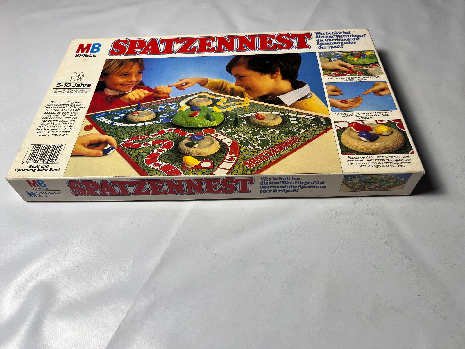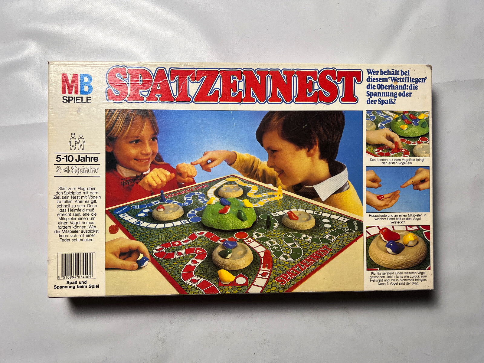 „Spatzennest“ von MB Spiele aus dem Jahr 1984 ist ein liebevoll gestaltetes Kinderspiel, das 2 bis 4 Spieler ab 5 Jahren auf eine spannende Flugreise einlädt. Ziel des Spiels ist es, das eigene Nest mit Vögeln zu füllen, indem man geschickt über den Spielpfad fliegt. Doch Vorsicht: Wer nicht rechtzeitig sein Heimfeld erreicht, läuft Gefahr, von Mitspielern herausgefordert zu werden. Das Spiel fördert spielerisch strategisches Denken und Reaktionsvermögen. Mit einer Spieldauer von etwa 20 bis 30 Minuten eignet sich „Spatzennest“ hervorragend für kurzweilige Spielrunden mit der ganzen Familie.