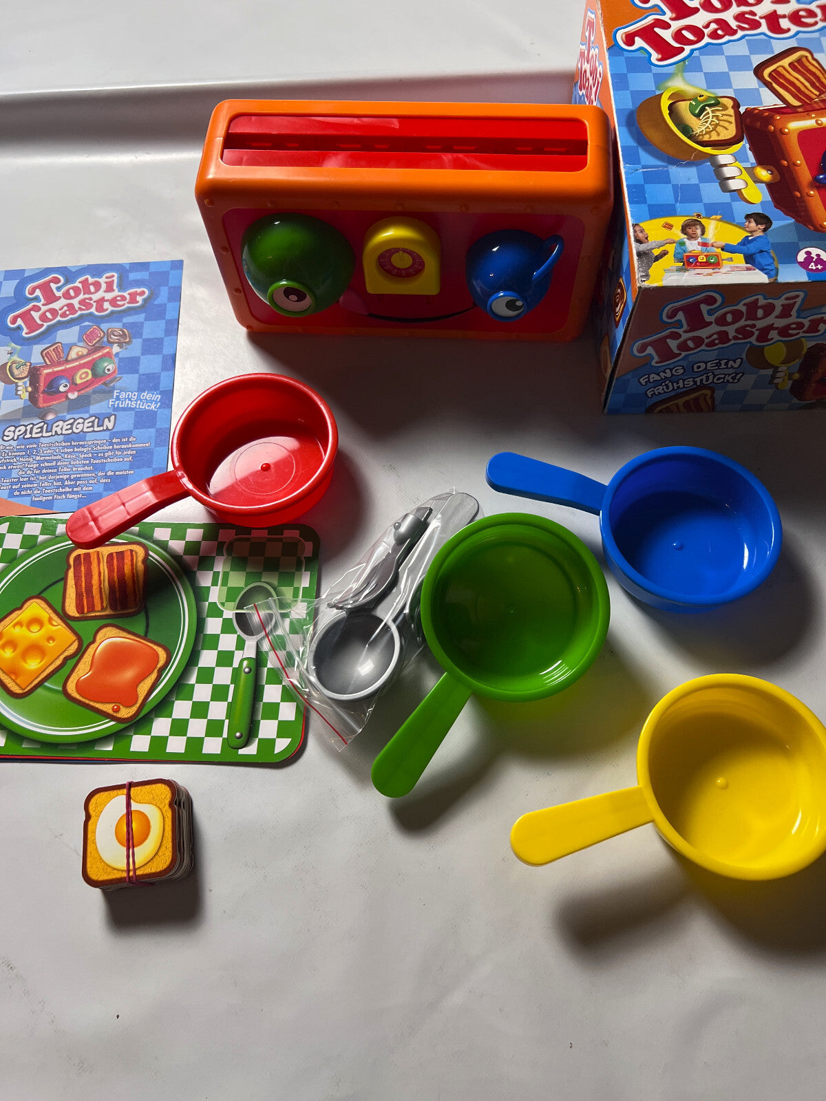 „Tobi Toaster“ ist ein spannendes Reaktionsspiel von Splash Toys, das für Kinder ab 5 Jahren geeignet ist. In diesem lustigen Spiel müssen die Spieler schnell reagieren, um die Toastscheiben aus dem Toaster zu fangen, bevor sie herausfliegen. Es fördert die Hand-Augen-Koordination und sorgt für jede Menge Spaß. Das Spiel ist vollständig und in einwandfreiem Zustand, ideal für schnelle Runden im Familien- oder Freundeskreis. Perfekt für junge Spieler, die ihre Reaktionsfähigkeit testen möchten!