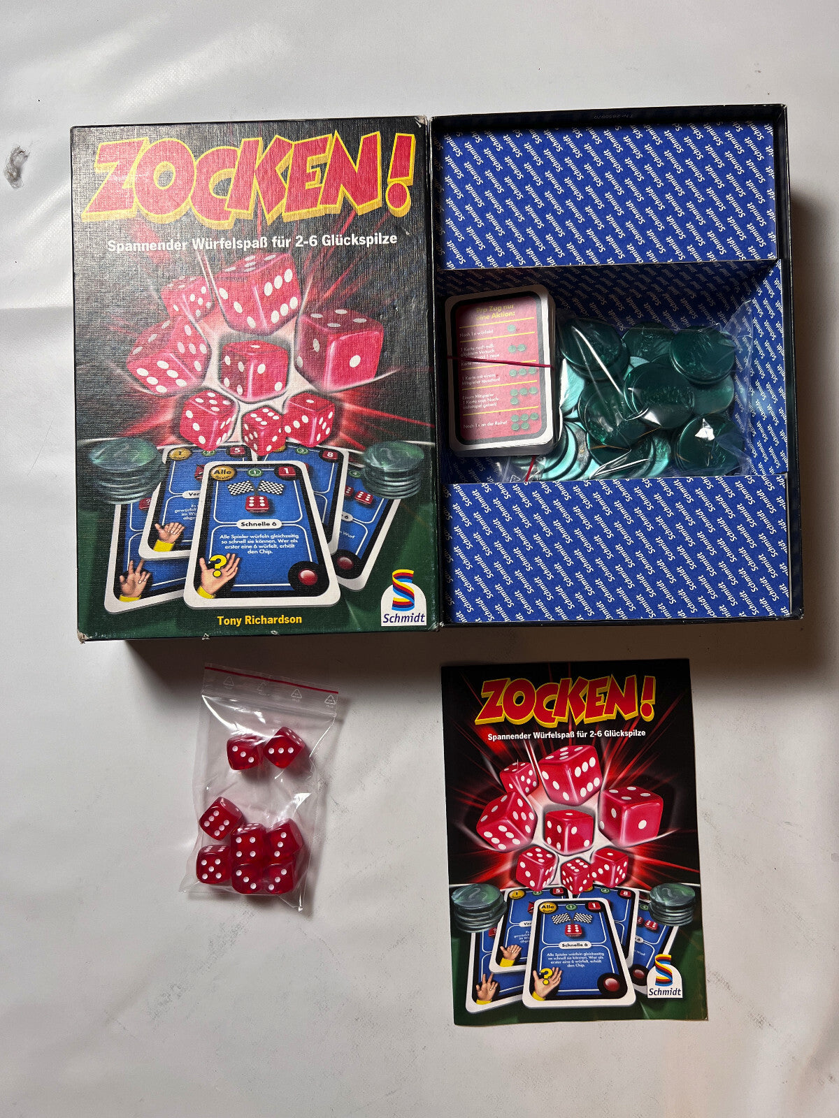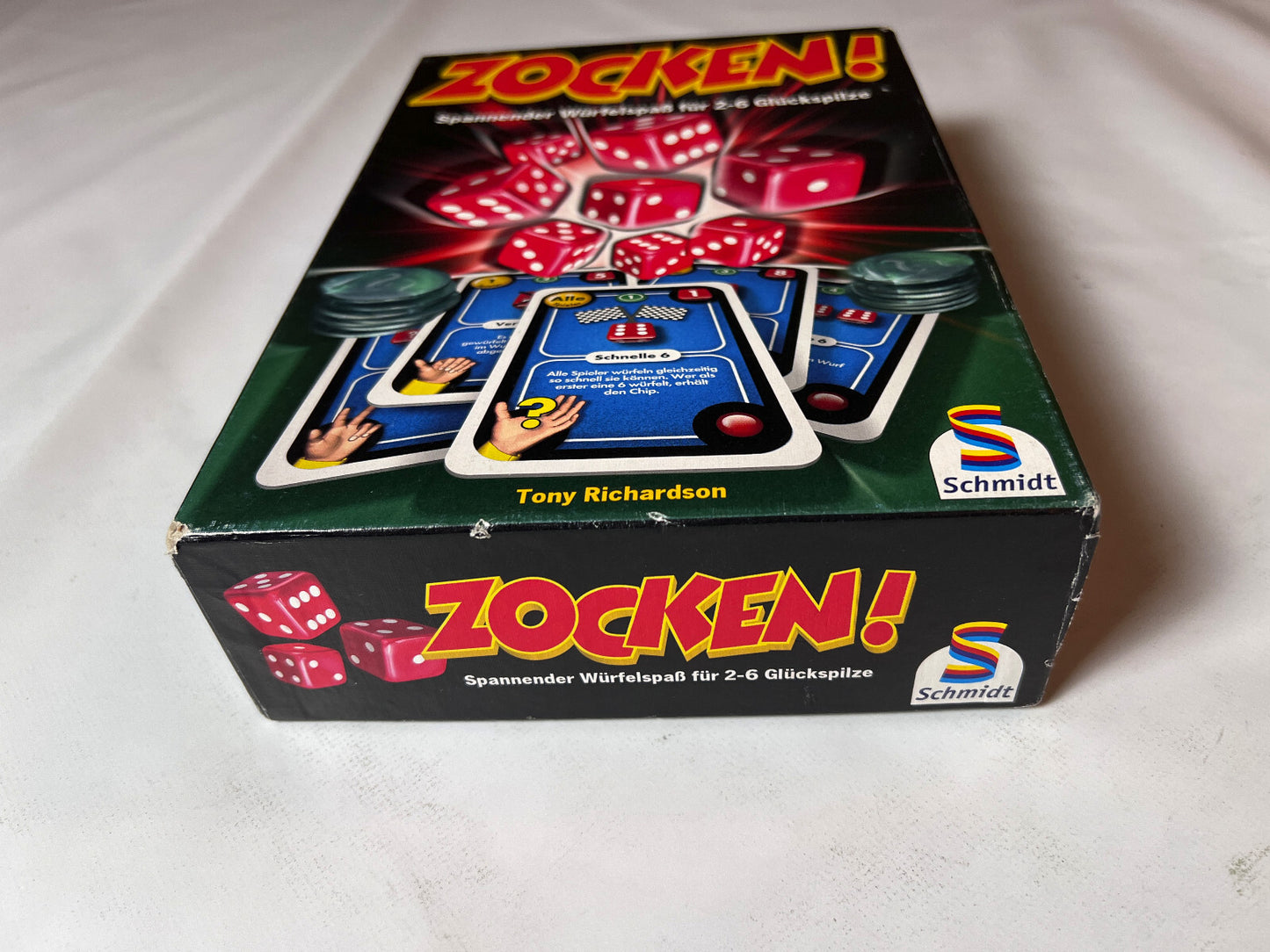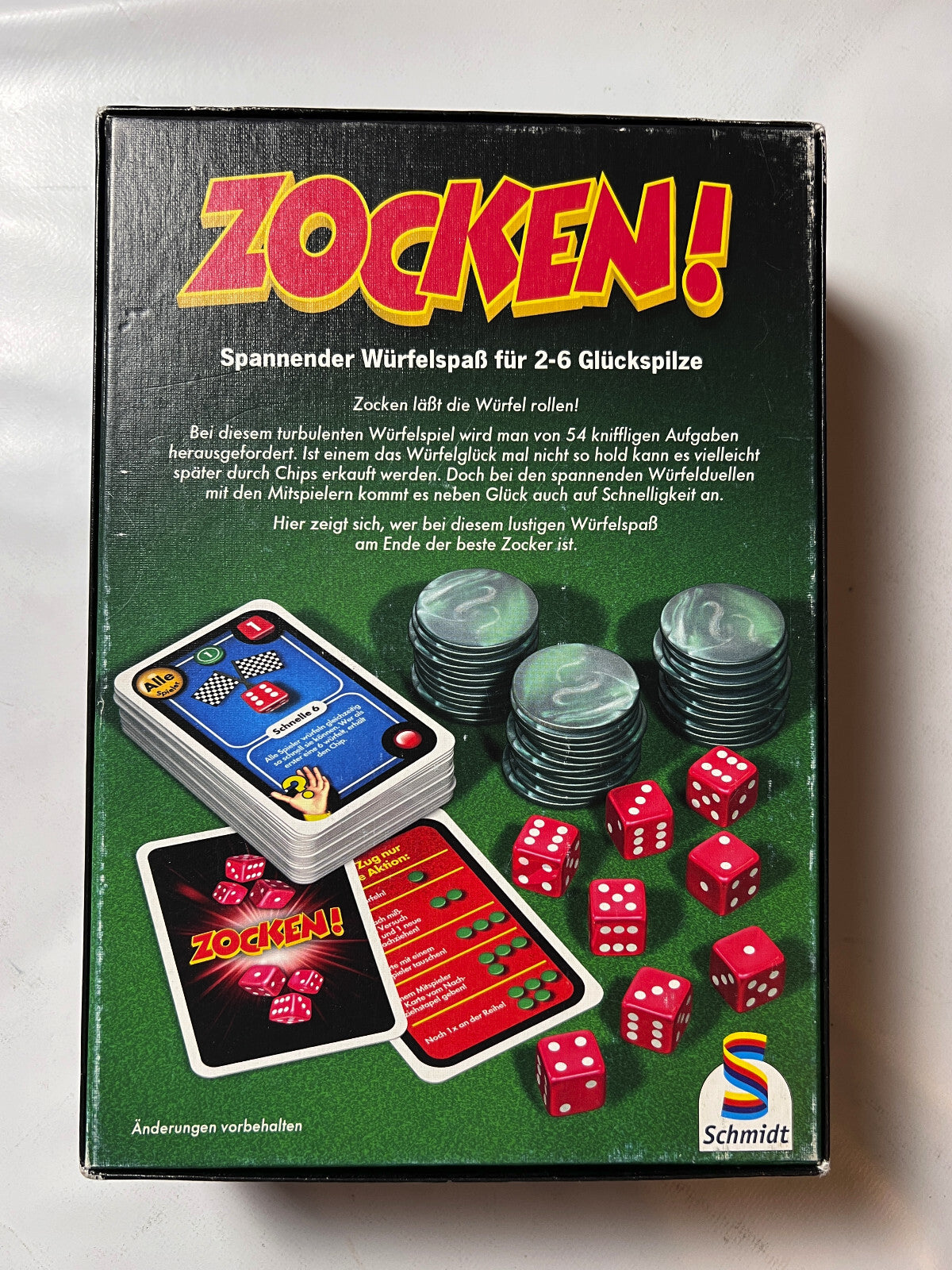 Zocken! von Schmidt Spiele ist ein spannendes Würfelspiel, das 2007 veröffentlicht wurde und für 2 bis 6 Spieler ab 8 Jahren geeignet ist. In diesem Spiel dreht sich alles um Würfelglück, taktisches Geschick und den Nervenkitzel des Wettkampfs.