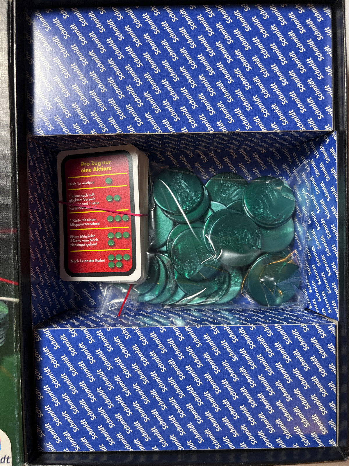 Ein zentrales Element von Zocken! sind die grünen Kunststoffchips, die als Belohnung für erfolgreich erfüllte Aufgaben dienen. Diese Chips können strategisch eingesetzt werden, um beispielsweise einen Würfelwurf zu wiederholen oder eine neue Aufgabenkarte zu ziehen. Dies ermöglicht es den Spielern, ihr Glück ein Stück weit zu beeinflussen und taktische Entscheidungen zu treffen.